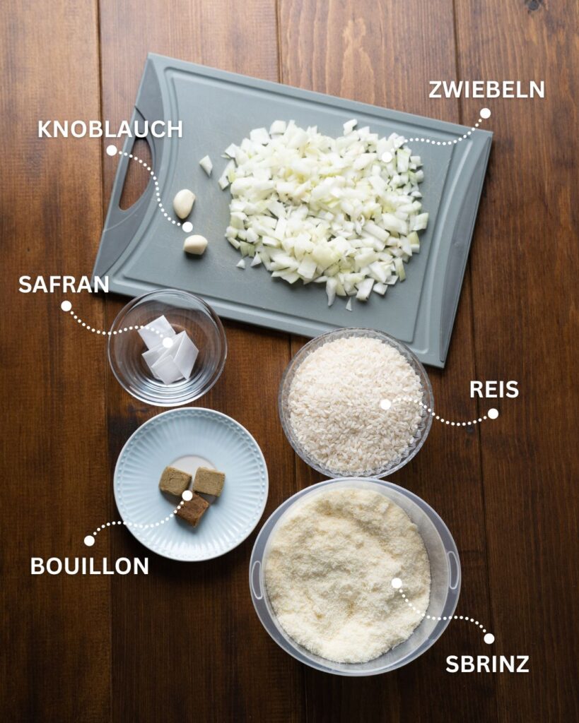 - Die Zwiebel hacken und den Knoblauch pressen. Anschliessend in Butter andünsten, Reis dazugeben und mitdünsten. Mit Bouillon ablöschen, vollständig einkochen.
